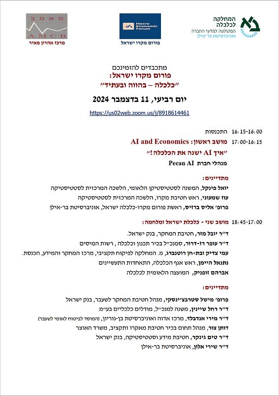 Israel Macroeconomic Forum is a discussion forum focusing on research and policy in macroeconomics and the Israeli economy. The forum meets 6 to 8 times a year at the Department of Economics, Bar-Ilan University, or online.